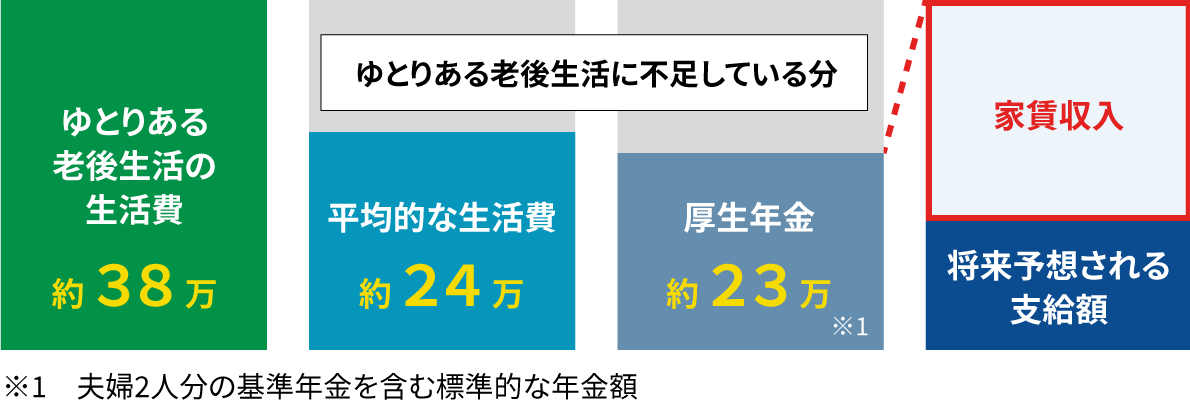 これに対し、年金の支給額は、厚生年金で約23万円(※1)、国民年金だと約13万円となっており、今後さらに支給年齢引き上げや、支給額の減少により、年金だけで生活していくのはなかなか厳しい状況なのです。