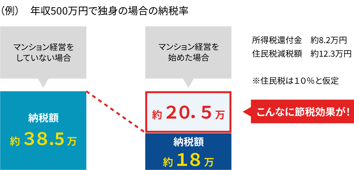 これにより不動産所得が赤字になると従来の給与所得から赤字分が差し引かれ(所得税法第69条、損益通算)、所得税が還付され、住民税が軽減されます。