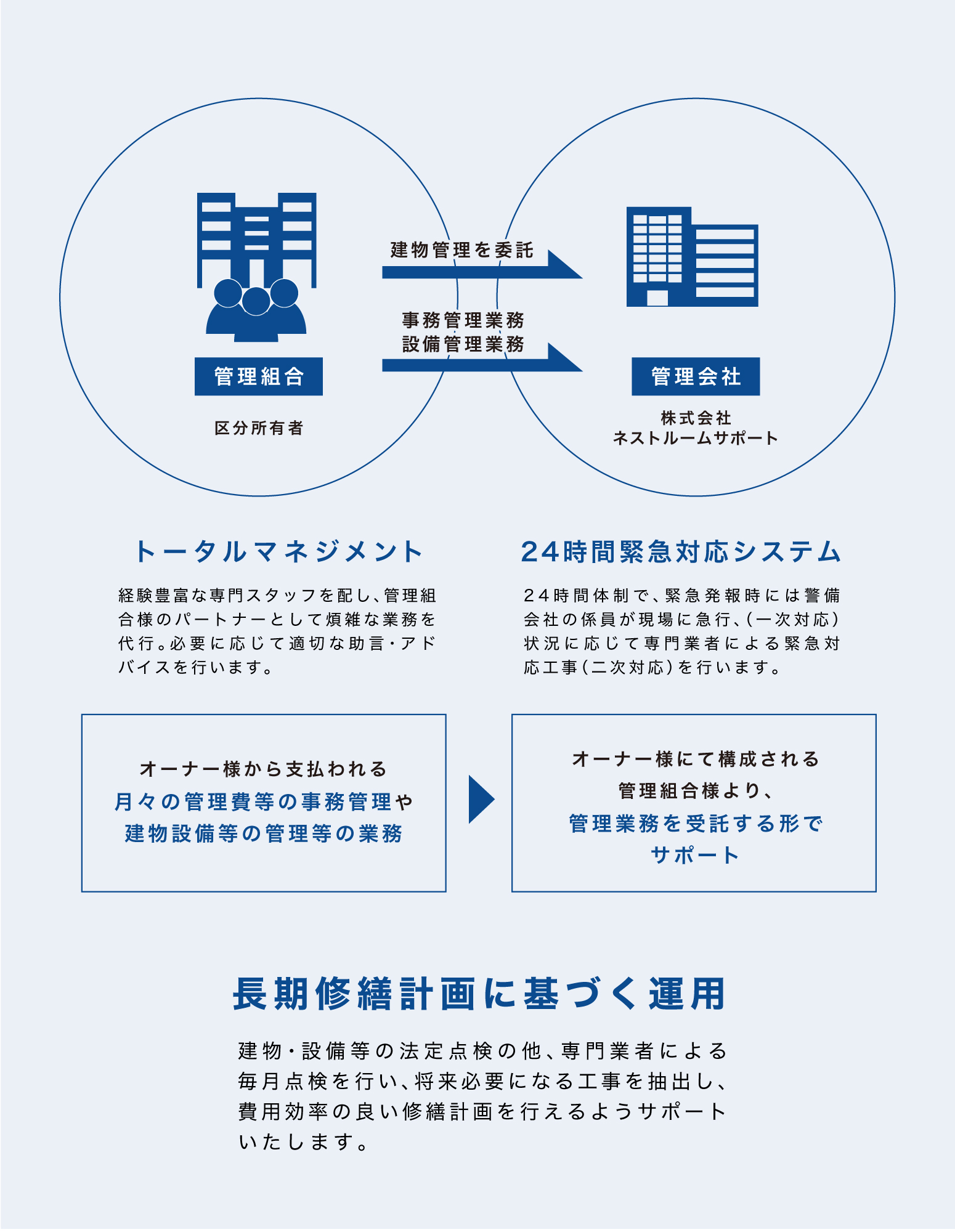 デベロッパーとして責任を持ち、マンションの企画・開発・販売から賃貸管理、建物管理まで、ワンストップで請け負う株式会社ネストを中心としたネストグループだからこそ、お客様に選ばれ続けています。