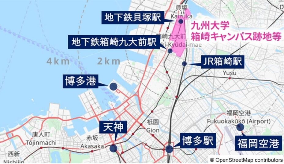 JR博多駅まで約4kmの距離に位置し、西鉄貝塚線・JR鹿児島本線および福岡市地下鉄箱崎線に囲まれている立地。対象敷地が約50ヘクタールという広大さは、国内はもちろん世界的にみても極めて珍しく、都市部にこれだけの規模のスマートシティを創りあげる構想は大注目されています。