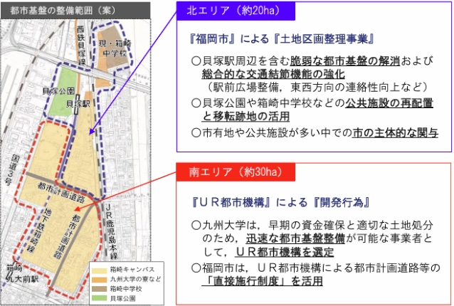 貝塚公園や箱崎中学校などの公共施設の再配置も行われ、箱崎中学校の跡地付近には2027年を目処にJRの新駅が開設予定。